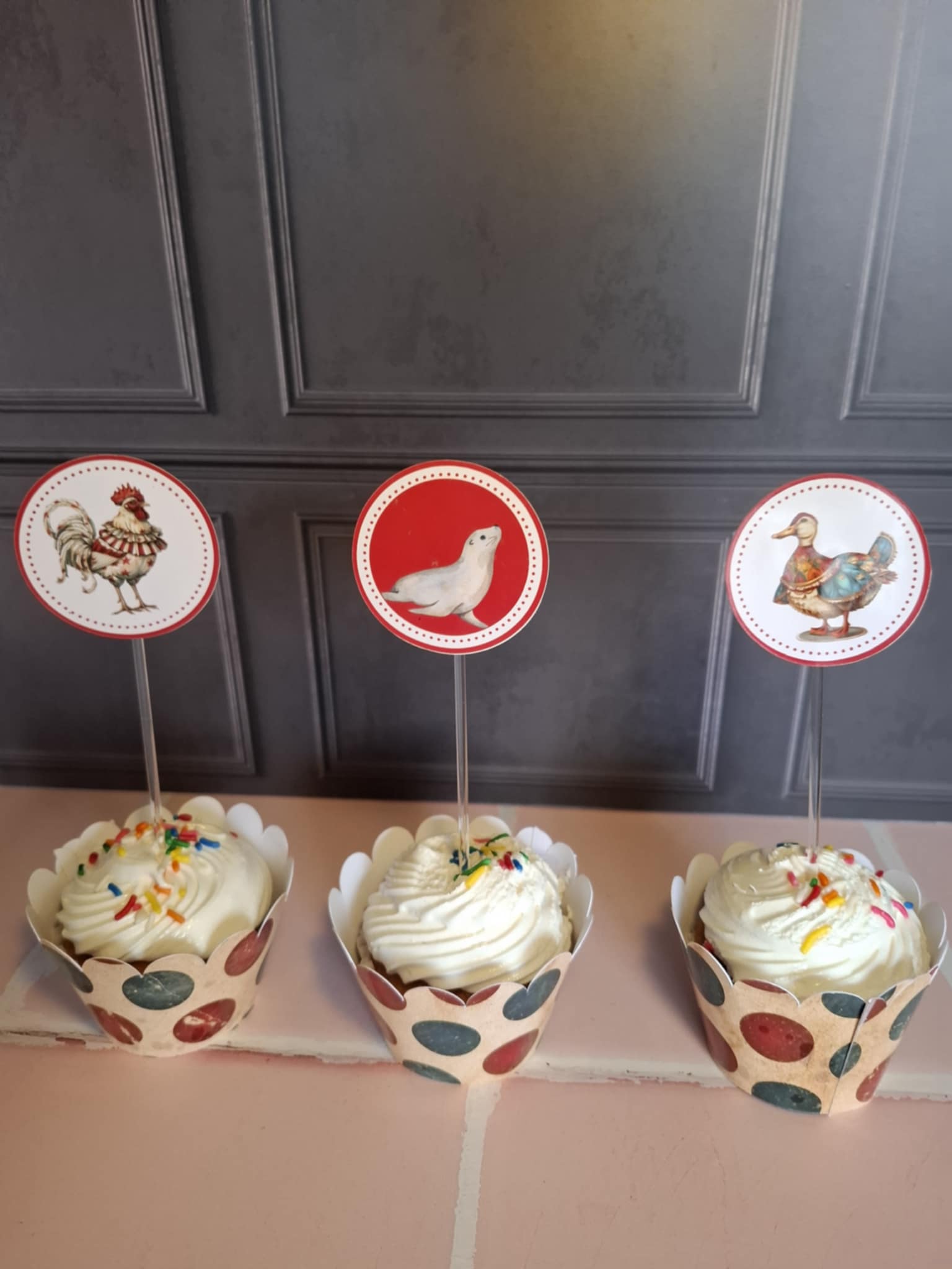 Cake Toppers con temática de «Circo». Redondos con palitos de acrílico. Variedad de diseños y colores. Con detalle de estrella roja.