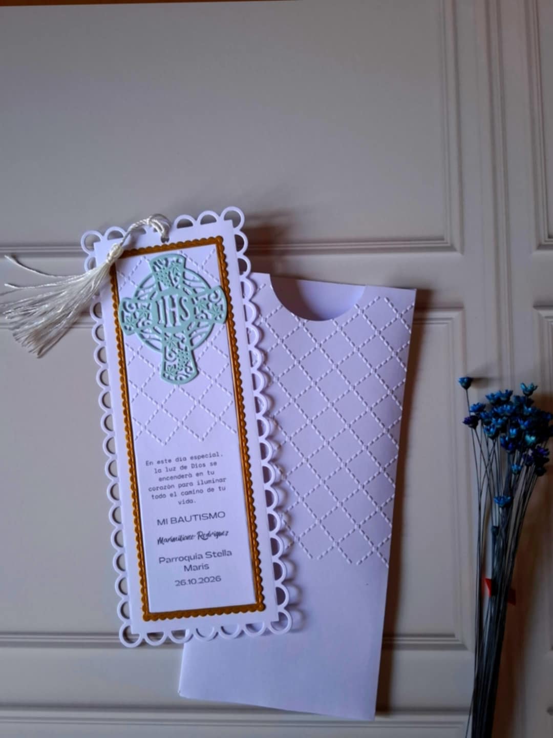 Tarjeta IHS de Bautizo. Tarjeta con relieve de dibujos y cruz troquelada con iniciales IHS en color verde. Superposición de distintos papeles. Sobre hecho a mano con detalle de relieve de líneas cruzadas. Borla color blanco.